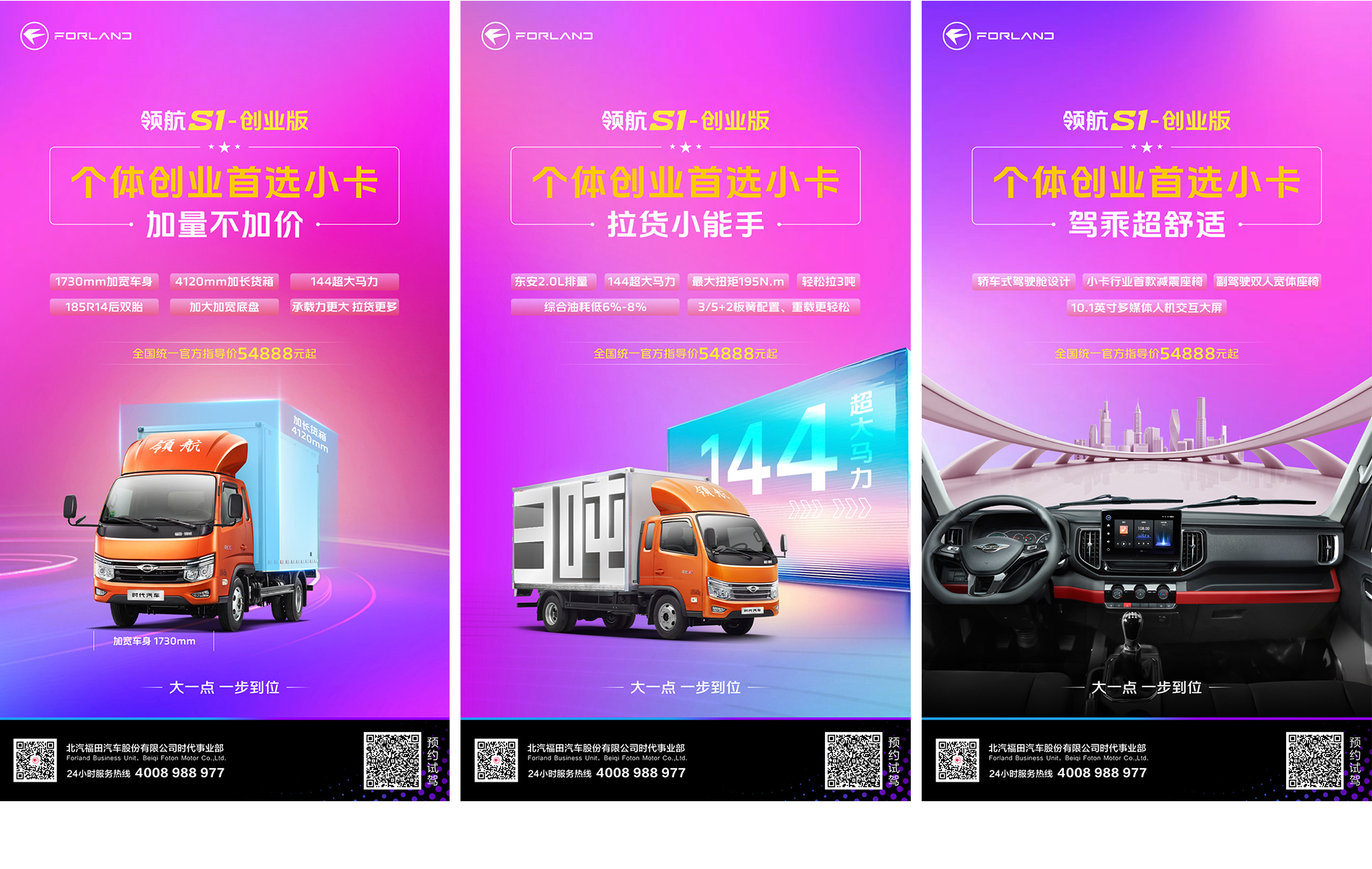 客户名称:时代汽车 服务内容:设计项目年度服务 时代汽车作为福田汽车双品牌战略的重要一极,涵盖微车、中轻卡、工程车、专用车、海外5大作战群,产品畅销全球50多个国家和地区,累积600万用户信赖。拥有7000余家销服网络,其中海外分销网点400多家。