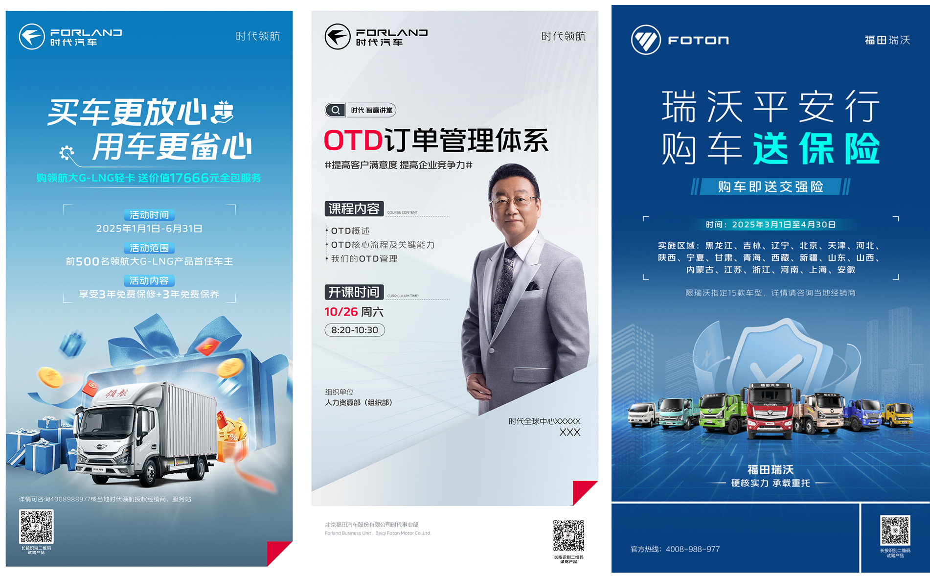 客户名称:时代汽车 服务内容:设计项目年度服务 时代汽车作为福田汽车双品牌战略的重要一极,涵盖微车、中轻卡、工程车、专用车、海外5大作战群,产品畅销全球50多个国家和地区,累积600万用户信赖。拥有7000余家销服网络,其中海外分销网点400多家。