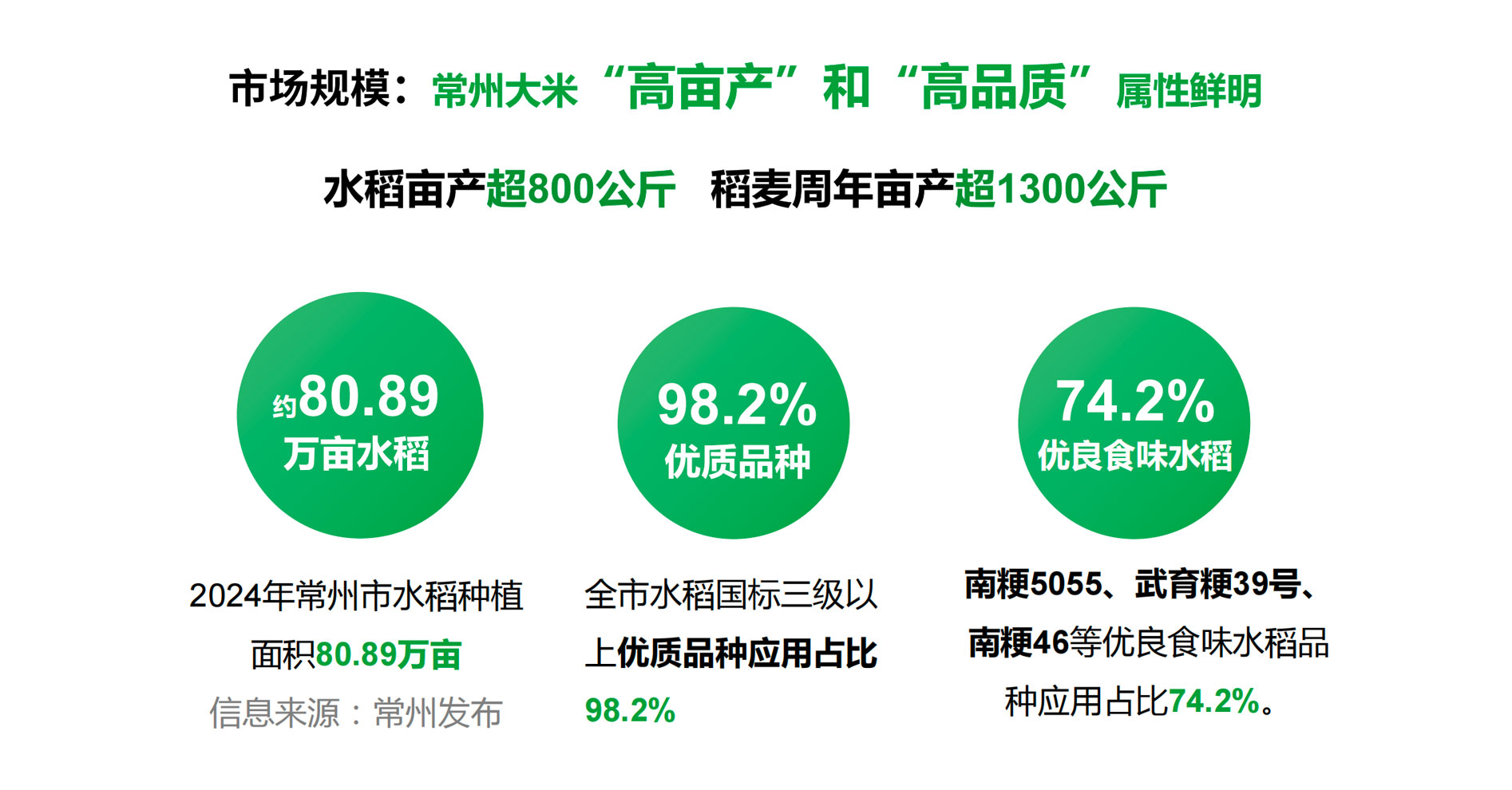 产业基础与供需格局:通过对水稻种植面积,优质品种占有率分析,获得常州大米“高产量+高品质”独特属性定位。结合食用大米需求量、深加工大米需求量统计,总结常州大米高附加值领域的供给缺口。